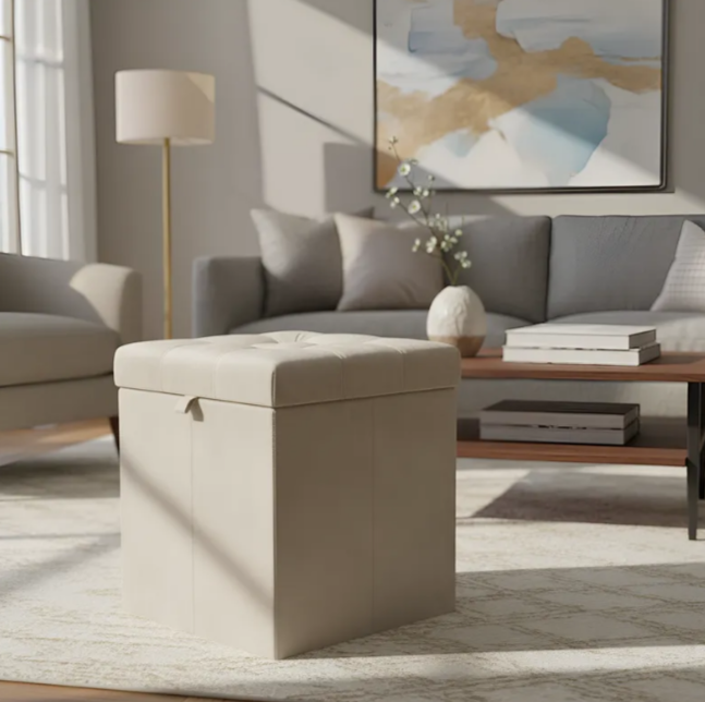 Puff Baú Estofado Quadrado Mari 36cm - Creme
