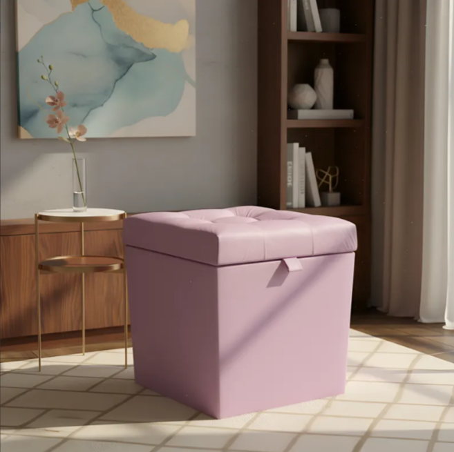 Puff Baú Estofado Quadrado Mari 36cm - Rosa Claro Corino