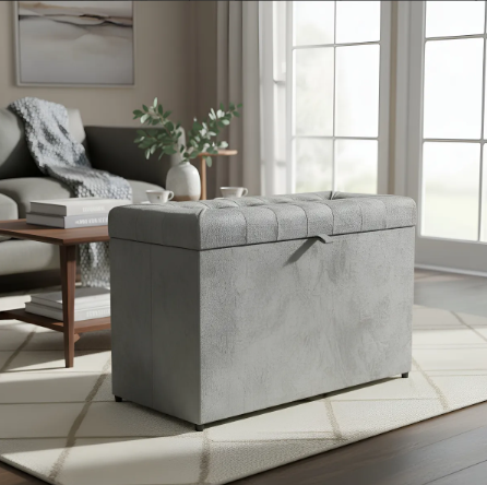 Puff Baú Retangular Estofado Com Pistão á Gás Para Sala, Quarto e recepção - Cinza Claro