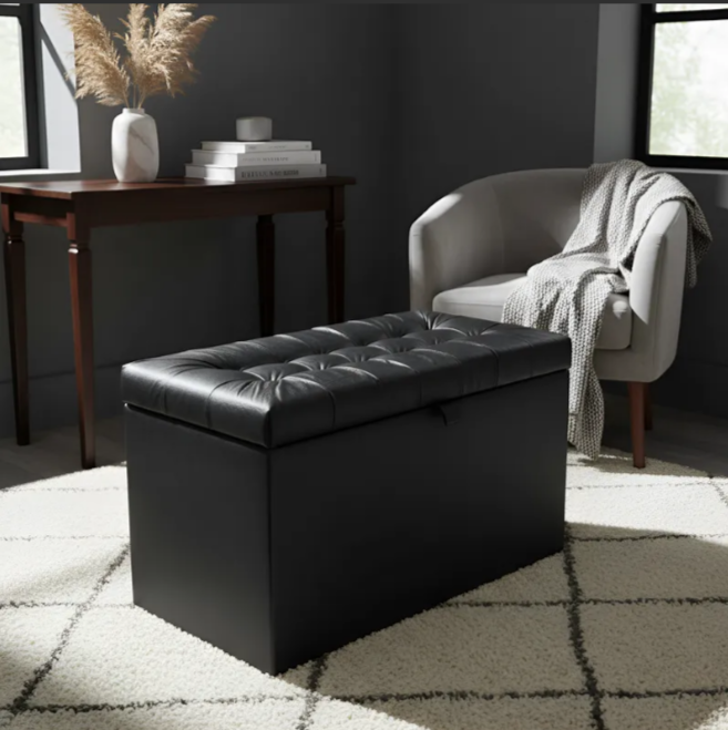 Puff Baú Retangular Estofado Com Pistão á Gás Para Sala, Quarto e recepção - Preto Corino